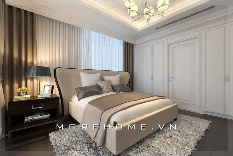 Thiết kế phòng ngủ chung cư nhỏ đẹp mắt, chiếc giường ngủ bọc da cao cấp cũng là xu hướng được nhiều khách hàng lựa chọn tại Morehome