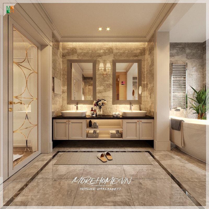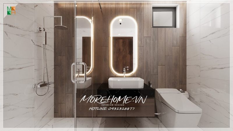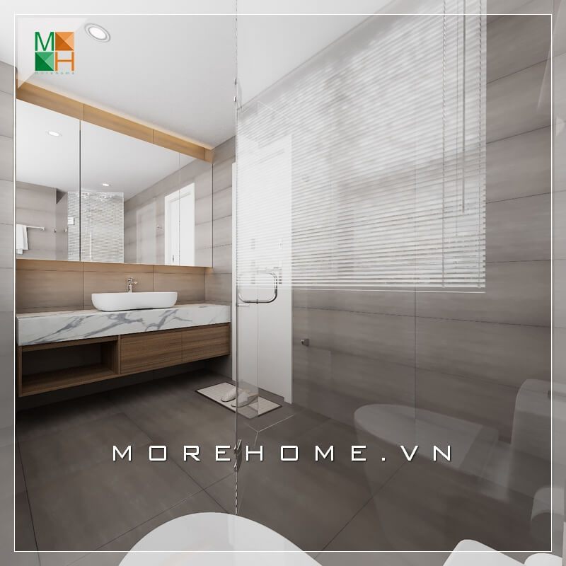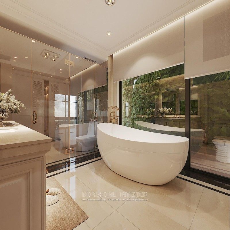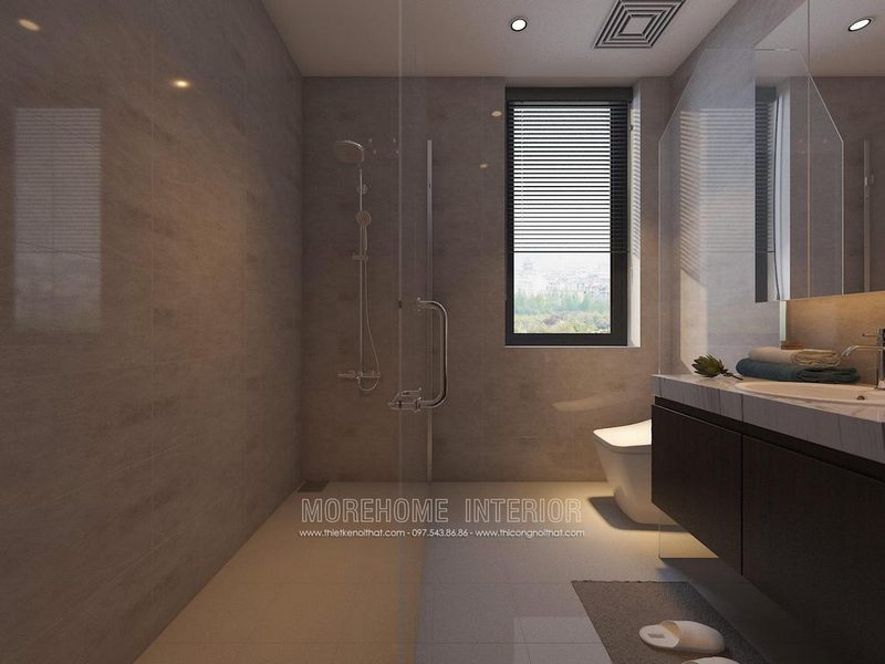 Nội thất phòng tắm được bố trí hợp lí, các loại thiết bị vệ sinh hiện đại, vách tắm kính, gương trang trí, đá nhân tạo... cũng được sử dụng tạo cho gia chủ mang lại sự sạch sẽ và sang trọng hơn