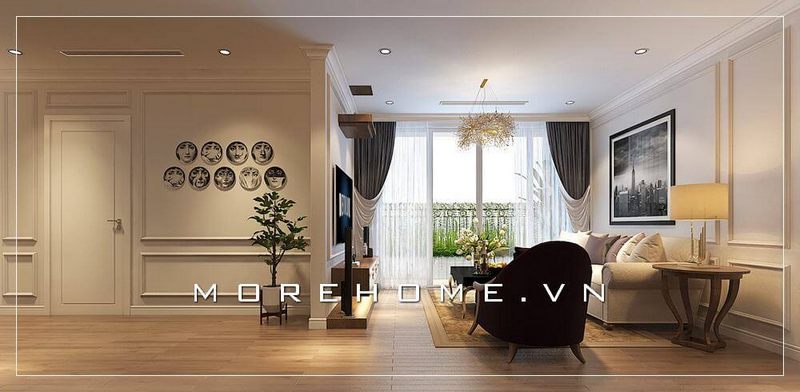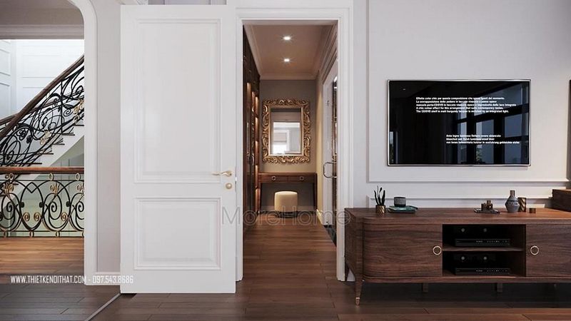 Không gian phòng khách ấn tượng với thiết kế tân cổ điển, sử dụng nền màu trắng chủ đạo tạo nên vẻ đẹp sang trọng và thoáng mát cho ngôi nhà