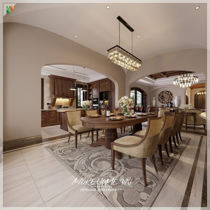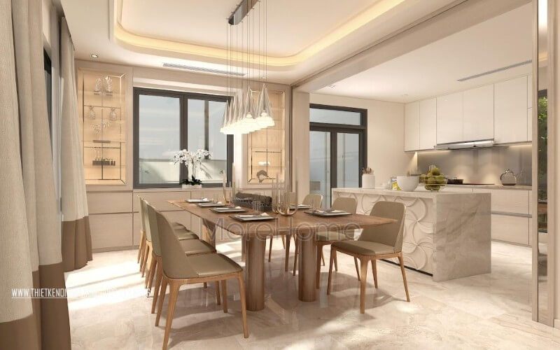 Thiết kế nội thất phòng ăn biệt thự hiện đại, liền kề với khu vực nhà bếp tạo sự thuận tiện nhất cho người