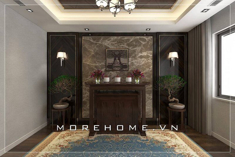 Mẫu thiết kế phòng thờ sang trọng mặt sau ốp đá vân mây màu nâu ghi kết hợp bộ bàn thờ gỗ tự nhiên cao cấp màu nâu trầm tạo nên một không gian phòng thờ sang trọng, đẳng cấp