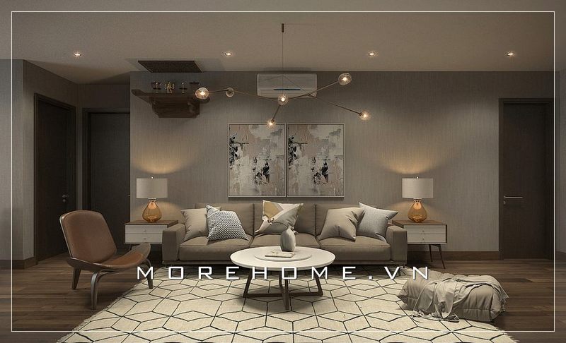 Phòng khách căn hộ chung cư trở nên gần gũi ấm cúng lại đẹp sang trọng với bộ sofa bọc vải màu xám tinh tế được thiết kế theo phong cách hiện đại kiểu văng ba tiện lợi.
