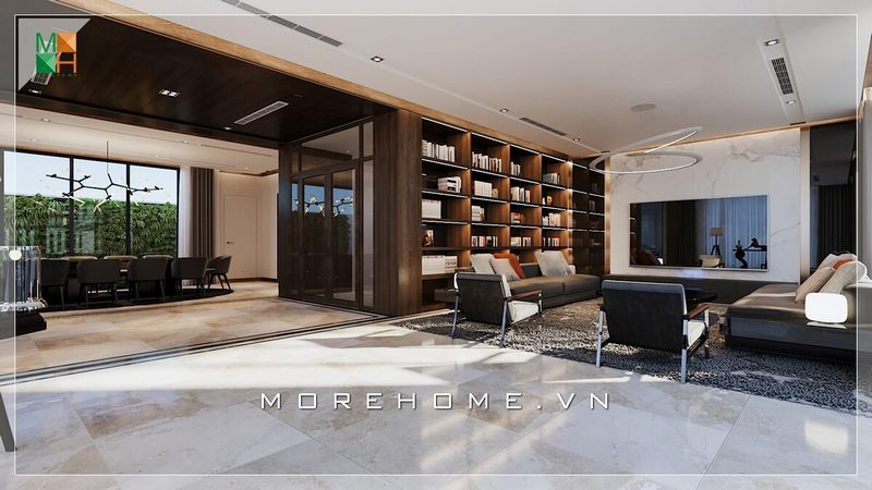 Bố trí nội thất phòng khách hiện đại đẹp với gỗ công nghiệp An Cường cao cấp cho biệt thự, nhà phố.