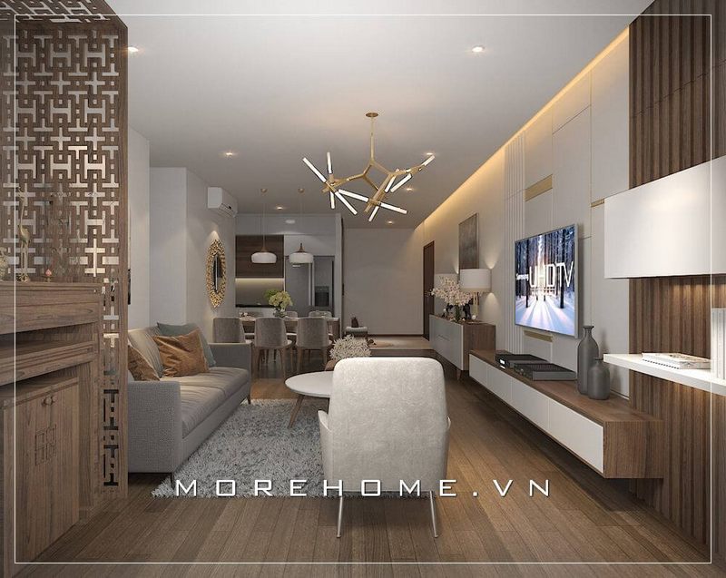 Bức tường thô cứng đơn sắc được thay thế bằng thiết kế tủ gỗ, kệ ti vi và kệ đồ kết hợp vừa đảm bảo tính công năng lại giúp tăng độ thoáng và tạo sự cơi nới tự nhiên cho không gian sinh hoạt chung.