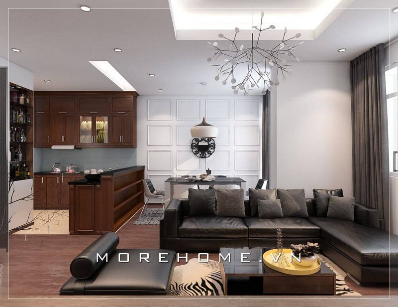Mẫu thiết kế phòng khách liền bếp ăn đẹp tạo cảm giác tiện nghi, thông thoáng cho không gian nhà phố, biệt thự.