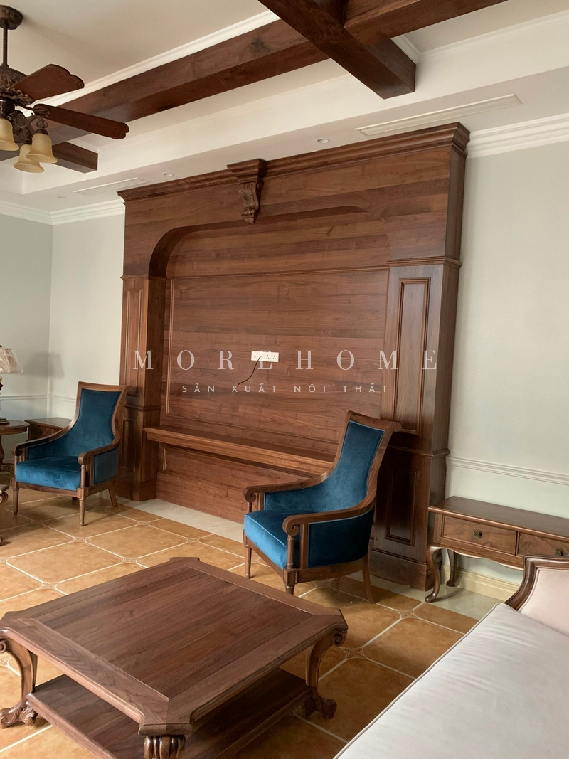 Nội thất phòng khách bằng gỗ óc chó tự nhiên thiết kế theo phong cách tân cổ điển sang trọng cho chung cư, biệt thự, nhà phố