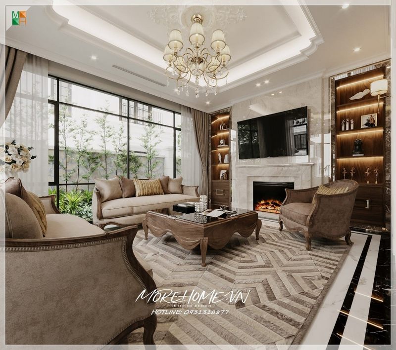 Thiết kế không gian phòng khách biệt thự sang trọng với nội thất tân cổ điển thể hiện cá tính và đẳng cấp của gia chủ