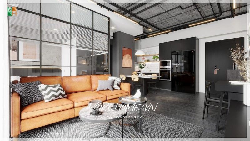 Phòng khách chung cư được ngăn cách với các phòng khác của hộ bằng lớp kính vách ngăn trong suốt tạo độ thoáng cho chung cư