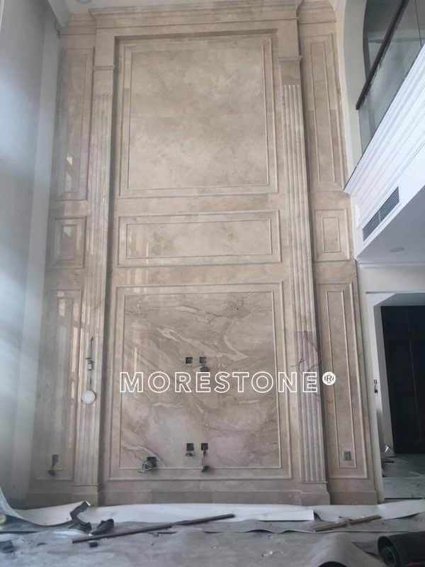 Morestone thi công hoàn thiện phòng khách cho gia chủ hiện đại với ý tưởng sử dụng đá ốp tự nhiên màu trắng sang trọng có những đường vân tinh tế, uyển chuyển.