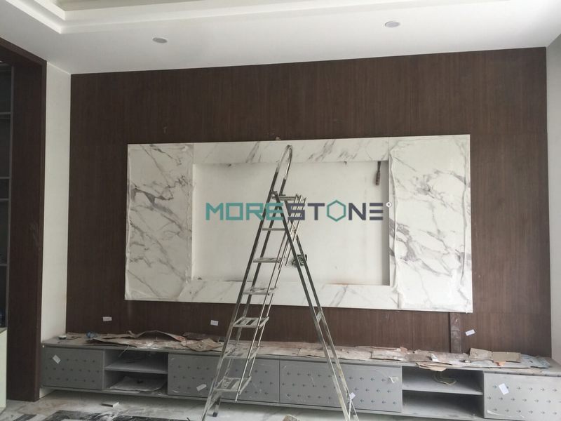 Đá ốp vách tivi màu trắng vân mây ấn tượng, thu hút điểm nhìn sự cao cấp cho không gian